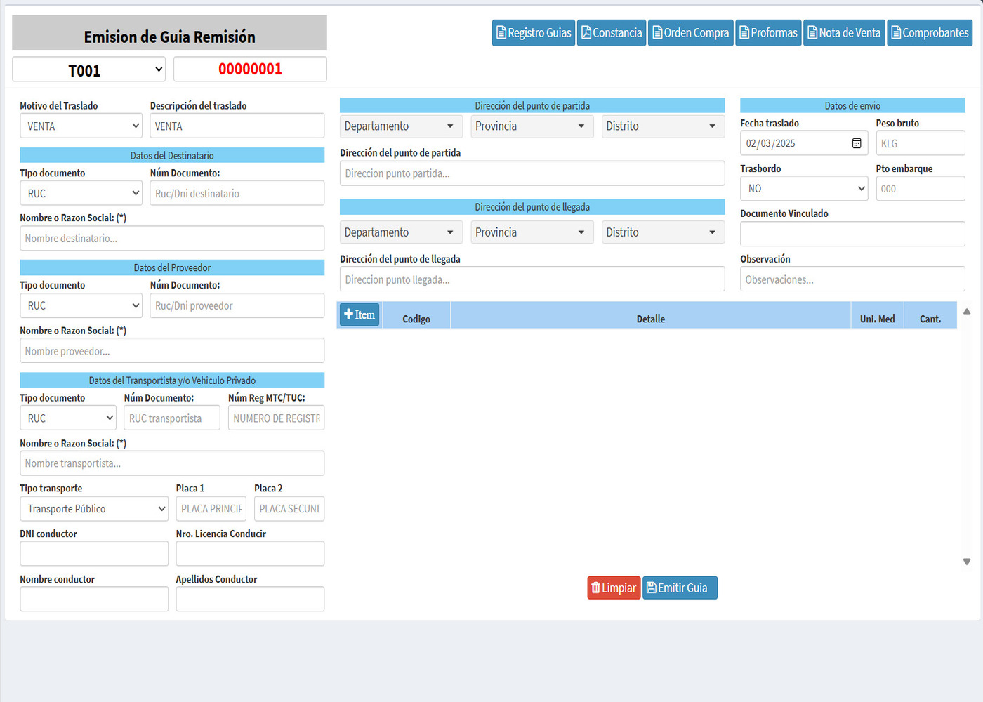 Facilita el transporte de tus productos con nuestro sistema de Guías de Remisión electrónicas. Genera y emite estos documentos de manera rápida y sencilla desde cualquier dispositivo, asegurando el cumplimiento normativo y una gestión eficiente del traslado de mercadería.
